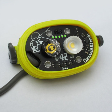 The v42 has two main LEDs. A focused spot LED and a wide angle flood LED with optic. In normal operation the v42 has four factory default power settings (see following table). The v42 also has 5 green smd indicator LEDs for battery charge level indication. Main LED also blinks 1-5 times, visible without removing helmet.