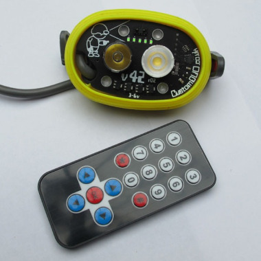 The v42 can be programmed using Customduo infrared remote control (cr2025 battery required). From 1-9 light settings can be specified, and the level of light provided by the spot and/or flood LEDs for each setting can be configured by the user. This is now even easier as the 5 green LEDs provide feedback!